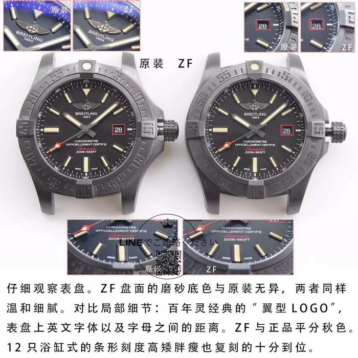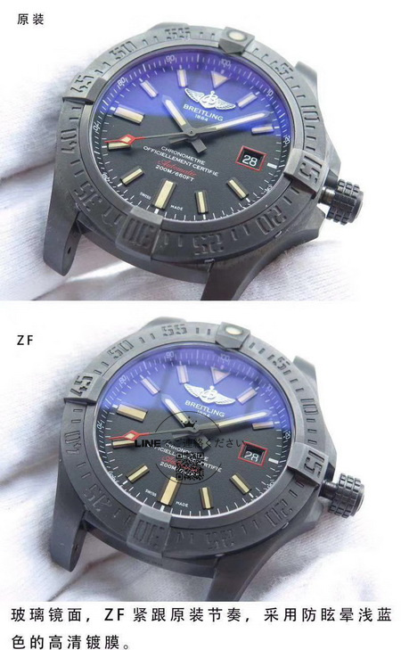 ブライトリングの風防デザインはIWCに近く、ガラスにはブルー反射防止コーティングが施されています。本アベンジャー レプリカも例外ではありません。