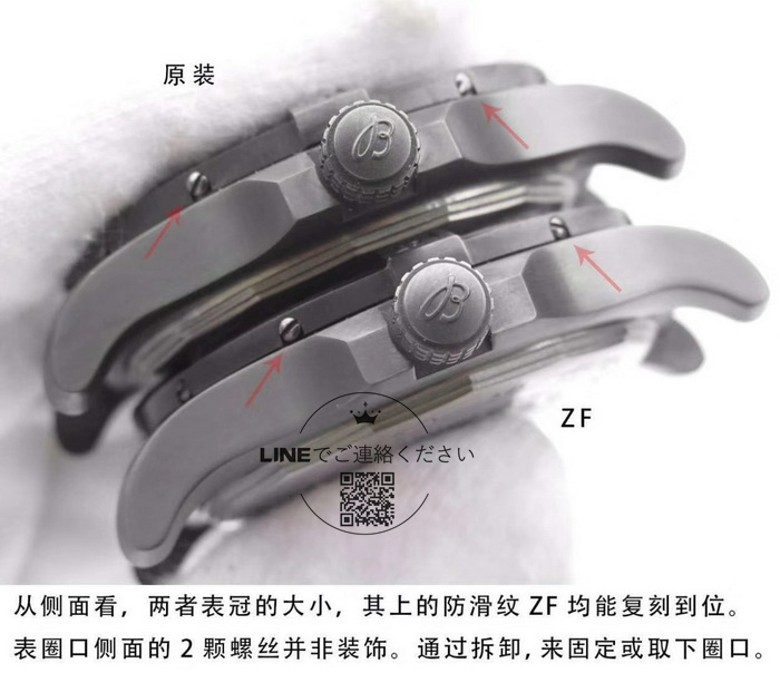 最新バージョンのレプリカは度重なる調整を経て、ケースカラーが正規品と見分けがつかないレベルにまで仕上げられています。なお、ケースカラーは完全なブラックではなく、金属感のあるブラックトーンとなっている点も正規品と同様です。ダイヤルの刻印仕上げも正規品と一致しており、夜光画像こそありませんが、現在のレプリカはスイス製夜光粉を使用し、発光色・明るさともに正規品に非常に近い仕上がりとなっています。