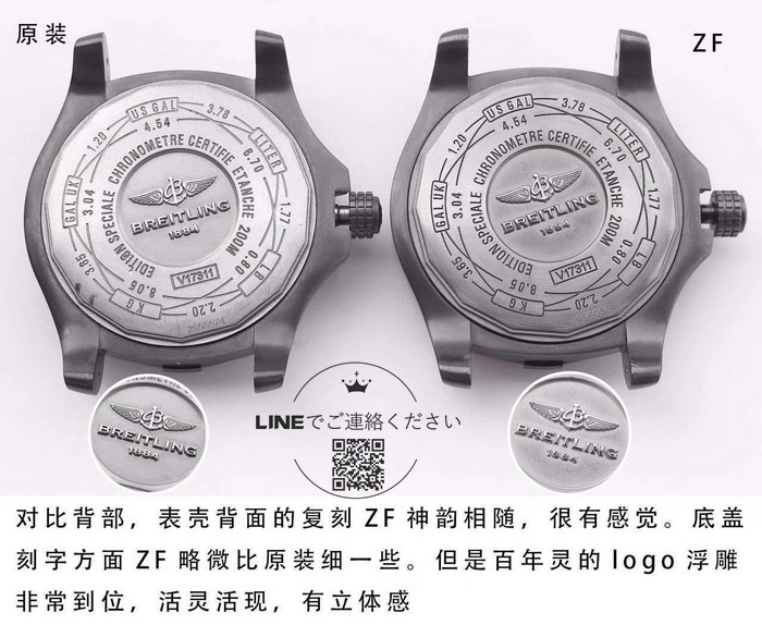 ケースバックはチタン本来のカラーを維持しており、拡大すると「BREITLING」の刻印が確認できます。彫りは非常に精巧で、金属エッジも丁寧にポリッシュ処理されています。