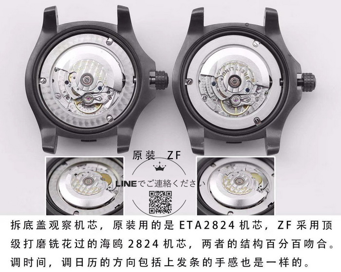 正規品はETA2824ムーブメントを搭載し、レプリカにはアジア製2824ムーブメントを採用。構造は同一で、パワーリザーブは約40時間となっています。