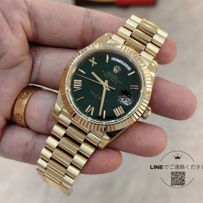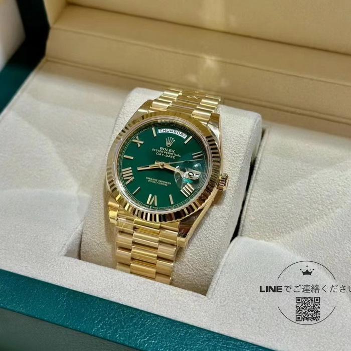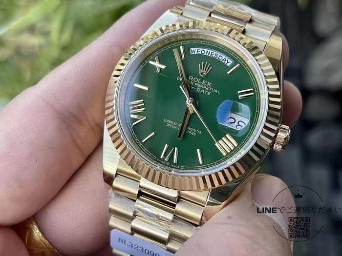 本日は、グリーンダイヤルを採用したロレックス デイデイト シリーズの時計をご紹介します。ケース径は40mmで、ムーブメントは2824または3255の2種類から選べます。特筆すべき点は、文字盤カラーが「ルーレットグリーン」デザインであることです。正規モデルでは18Kイエローゴールドが使用されており、全体として高級感が漂います。