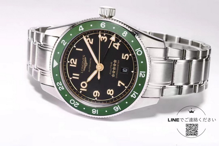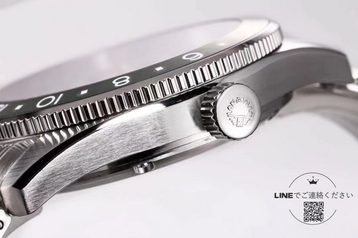 ケース径は 42mm で、ミリタリーグリーンダイヤルと両方向回転式セラミックベゼルを備えています。ムーブメントには信頼性の高い 2836 が搭載され、デュアルタイム表示機能を持っています。サファイアクリスタルを採用し、防水性能は 100メートル以上 です。スーパールミノバ夜光により、暗所でも優れた視認性を確保しています。グリーンダイヤル仕様のこのスポーツ系ロンジン オマージュウォッチは、愛好者の間で非常に人気のあるモデルです。
