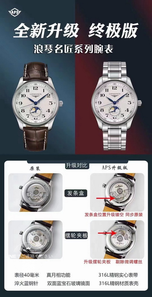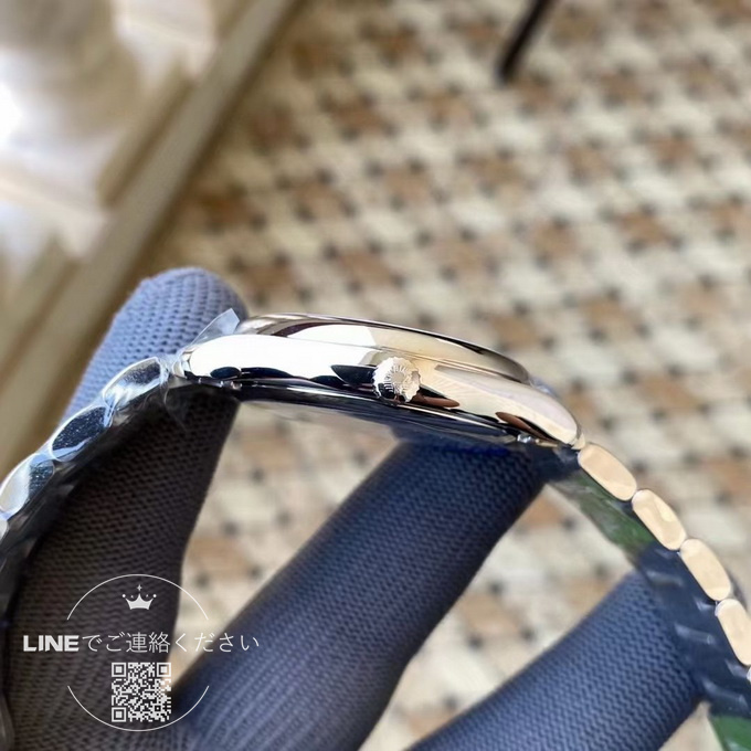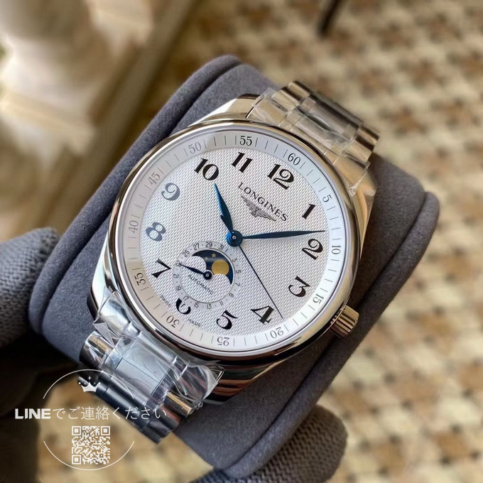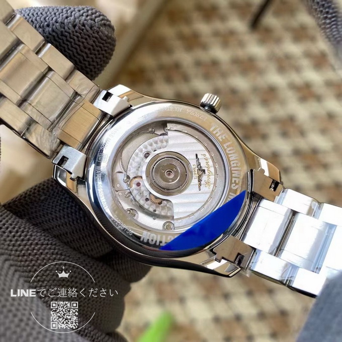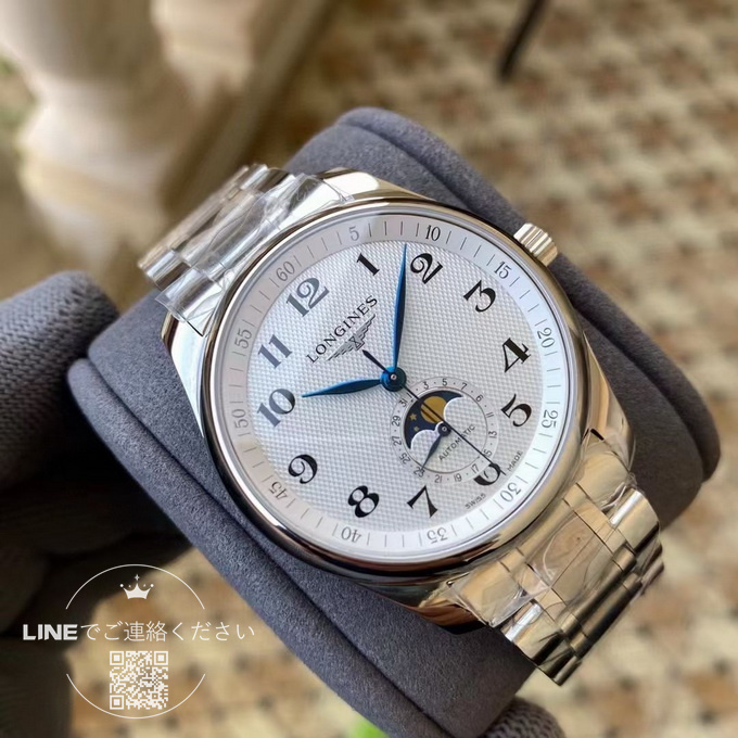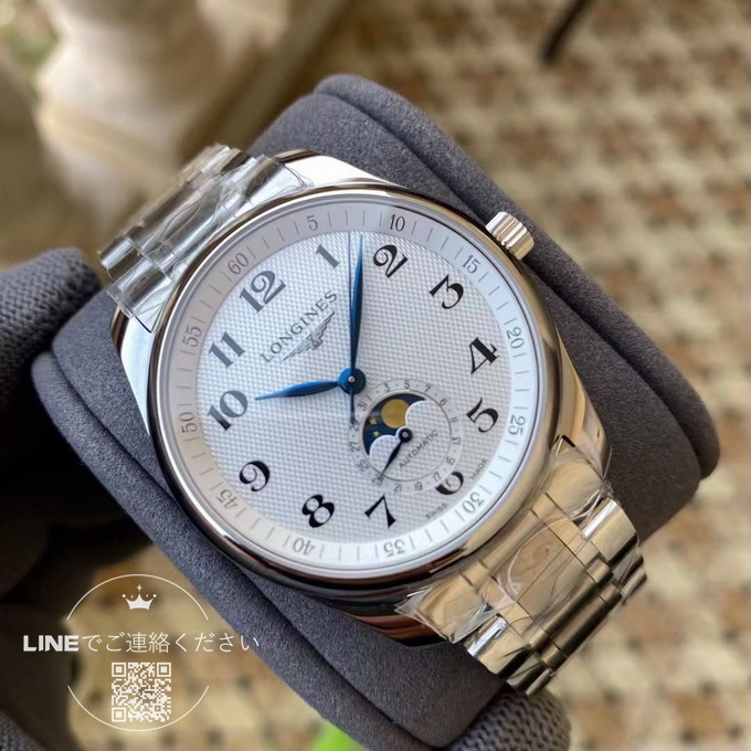 このロンジン マスターコレクション ムーンフェイズは、直径40mm、厚さわずか11mmのサイズで、ムーブメントには2892キャリバーを搭載しています。ムーブメントの地板の質感やスチール刻印は正規品と完全に一致しており、両面にサファイアクリスタルガラスを採用しています。6時位置にはムーンフェイズ表示があり、機能は正規品と同様に動作します。文字盤の数字や針の繊細さも正規品と全く変わらない仕上がりです。入門用のスイスブランド腕時計やプレゼントをお探しの方にとって、このロンジン マスターコレクション L2.909.4.78.6 は非常におすすめの一本です。